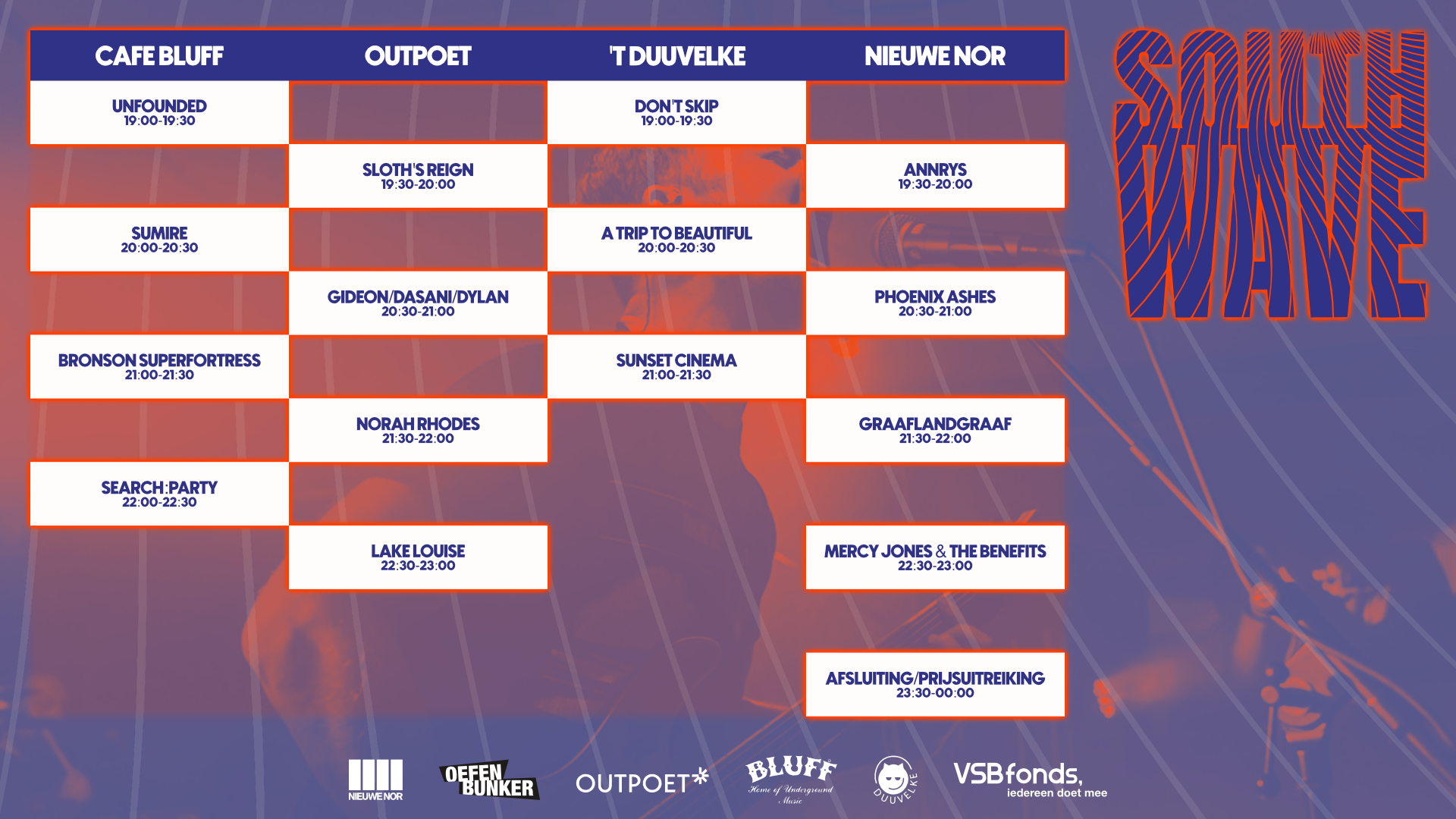 [Showcasefestival South Wave inclusief de workshops en de netwerkborrel zijn gratis toegankelijk en worden mede mogelijk gemaakt door VSB Fonds. Deelnemende locaties zijn Poppodium Nieuwe Nor, Cultureel Centrum Outpoet, Café Bluff & 't Duuvelke]